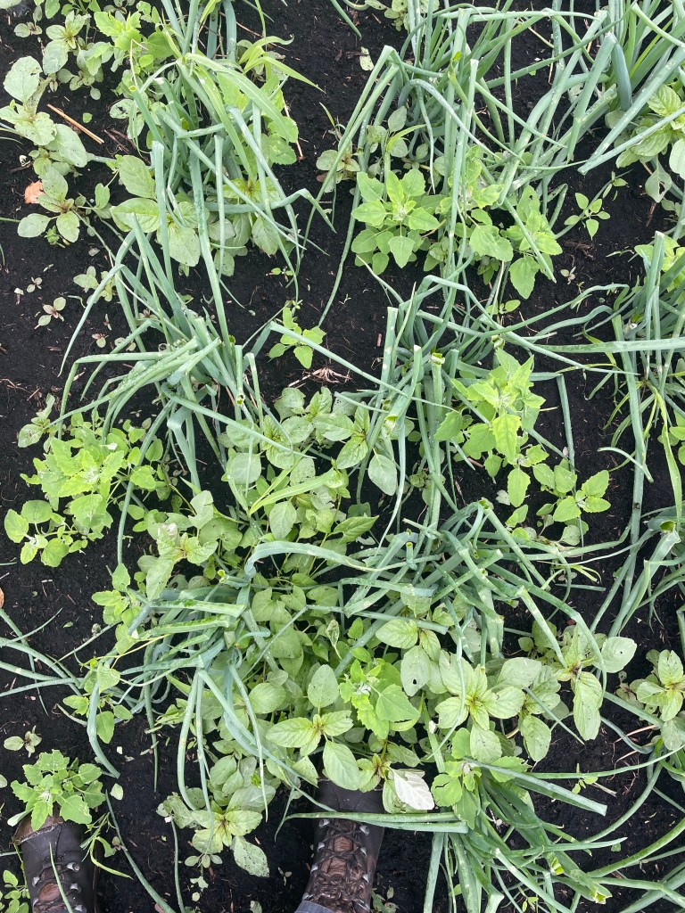 Hier – völlig verunkrautete Zwiebeln mit Hagelschaden (da haben wir noch einiges an Arbeit vor uns)